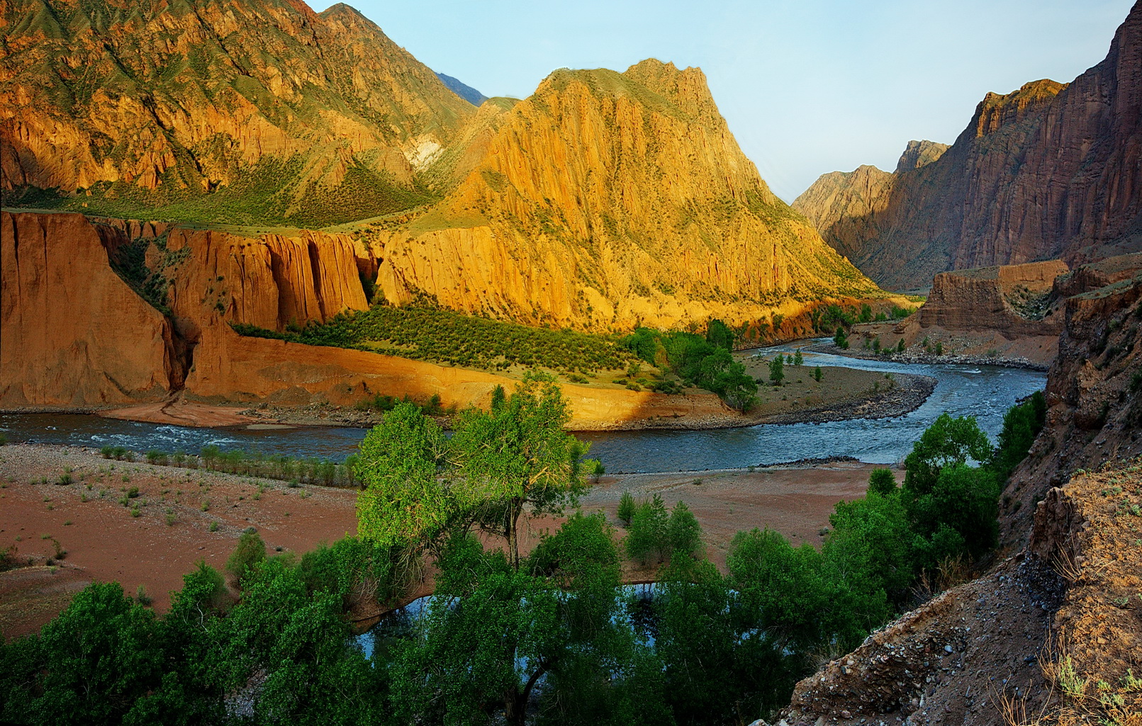 Afterward, we head toward the village of Kyzyl-Oy. The scenic road takes us through a gorgeous canyon with a turquoise river, set against a backdrop of stunning green and ochre cliffs. This is a photographer's paradise, with landscapes that feel almost surreal.